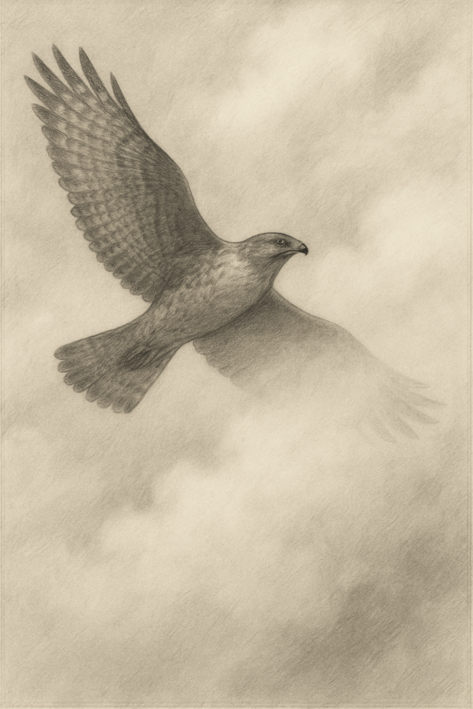 Then she saw it: a hawk cutting through the mist, wings wide, gliding swift. For a moment, it vanished completely, swallowed by cloud, and reappeared again like a new idea.
